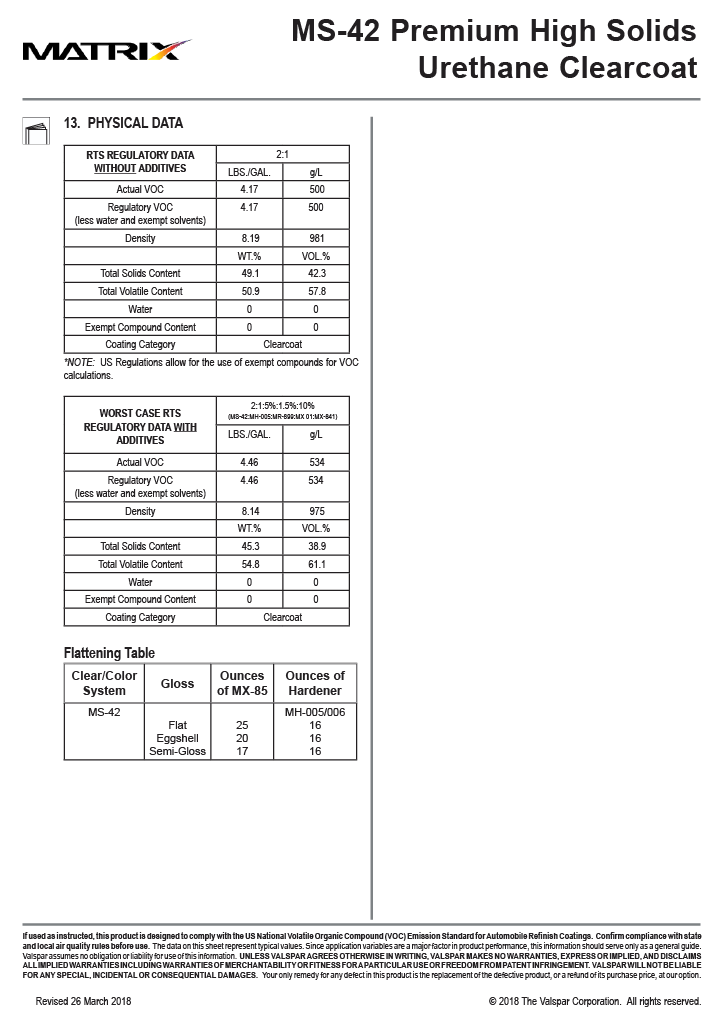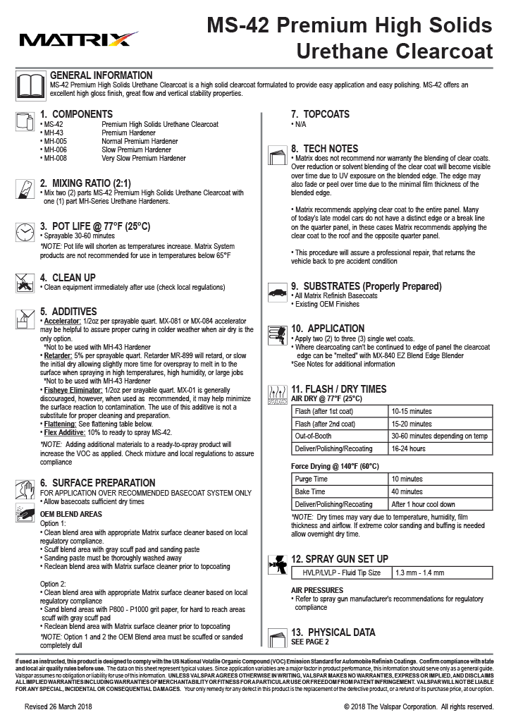 MS-42 Premium High Solids Urethane Clearcoat is a high solid clearcoat formulated to provide easy application and easy polishing. MS-42 offers an excellent high gloss finish, great flow and vertical stability properties.